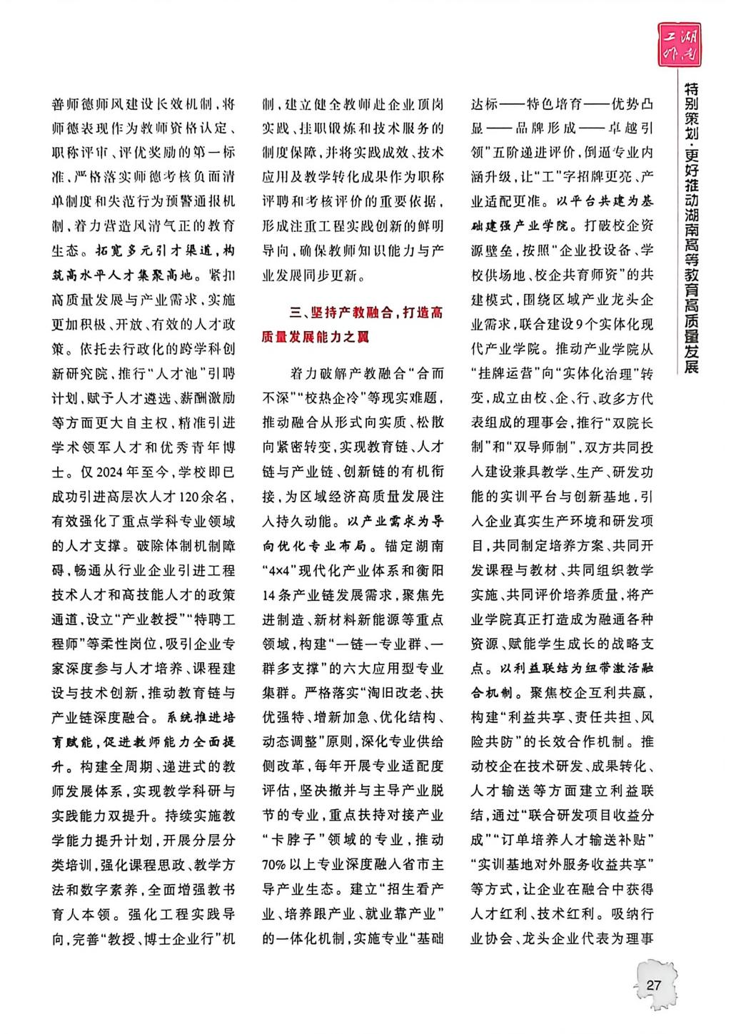 编者按:近日,省委《湖南工作》2025年第10期刊发我校党委书记曹执令教授署名文章《以“四个坚持”推动地方应用型工科院校高质量发展》。文章从“坚持培根铸魂,把稳高质量发展方向之舵;坚持强师赋能,夯实高质量发展人才之基;坚持产教融合,打造高质量发展能力之翼;坚持深化改革,激活高质量发展动力之源”四个方面,向全省推介金冠网址线路检测中心在开拓地方应用型工科院校高质量发展新境界的典型做法与工作经验。